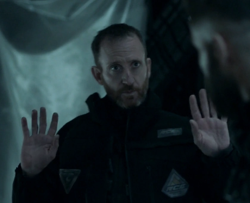 RCE Guard Mason with his arms raised after being disarmed by Amos