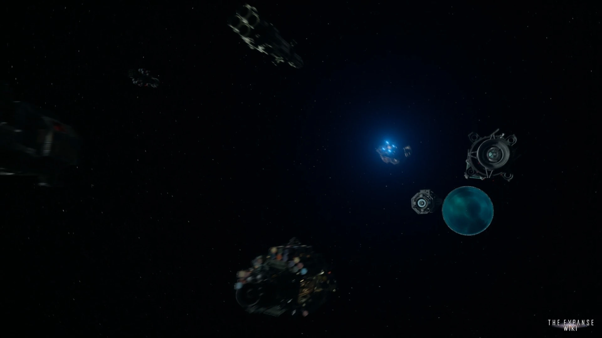 In pursuit of the Rocinante, the MCRN Xuesen enters the Ring, launching several probes to test the boundaries of the slow zone. The Behemoth transits the Sol gate at a later point as well, along with its many escort craft.[5]