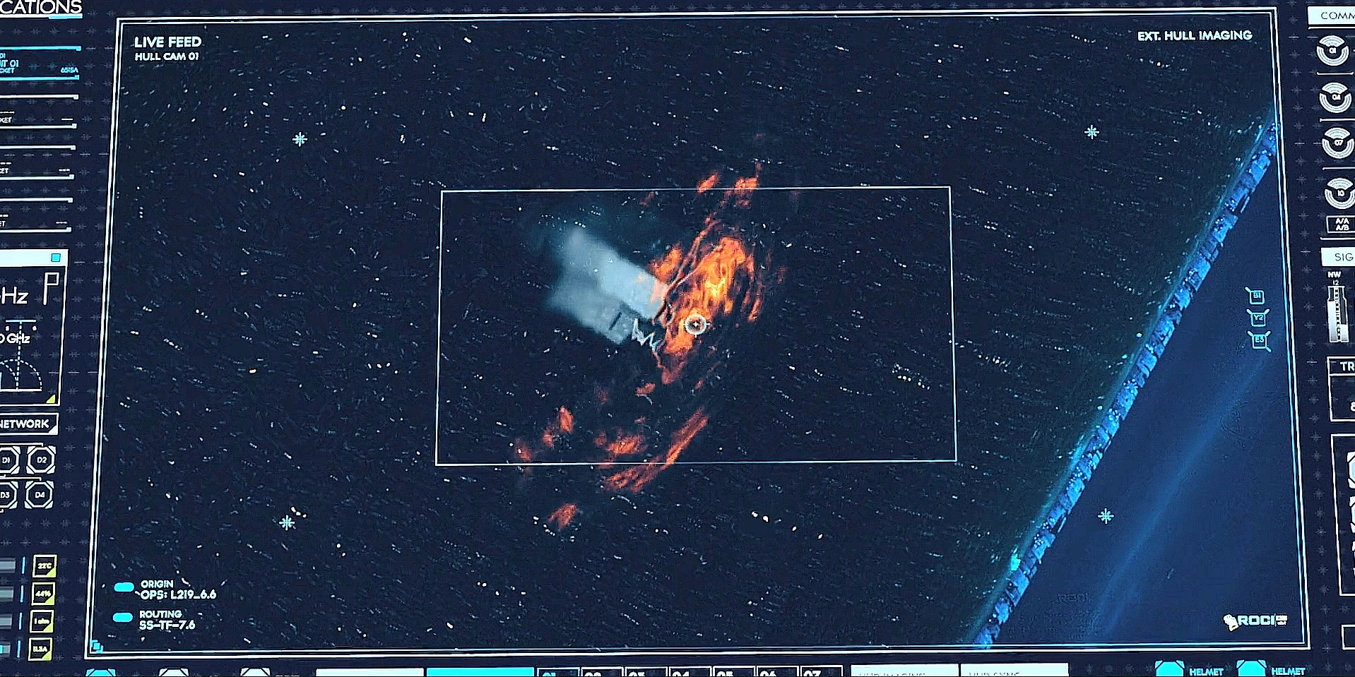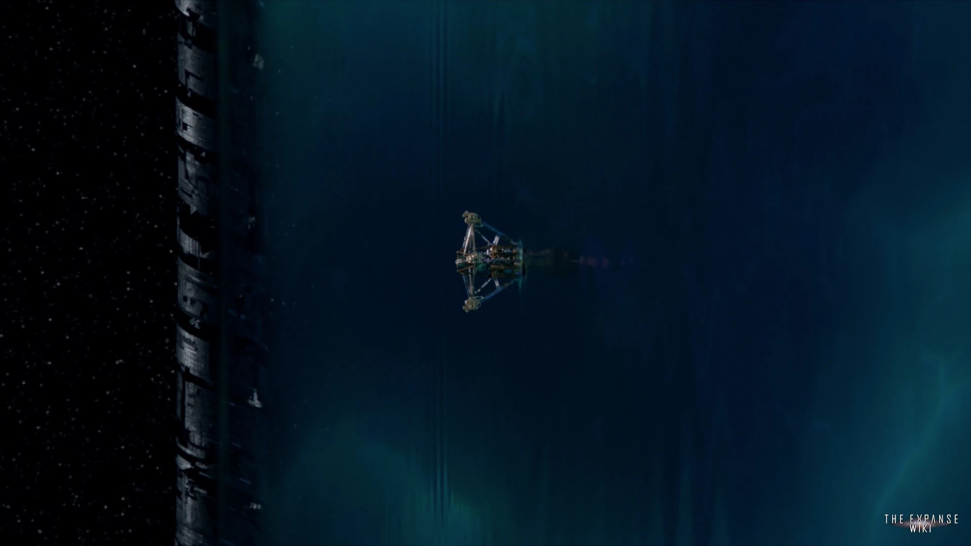 Following Clarissa Mao's broadcast of a faked message from James Holden proclaiming the Belt's supremacy over the ring and claiming responsibility for the bombing of a UN supply ship, the Rocinante is fired upon by the OPAS Behemoth. With the Rocinante's core systems disabled through sabotage, the ship faces destruction as Holden pleads for a protomolecule-projected Miller's advice. "Miller" warns Holden to not enter the Ring too fast, and Holden orders the Rocinante into the Ring, with a massive deceleration to slow the ship down. Moments away from the ship's destruction from the Behemoth's torpedo, it successfully enters the Ring, which stops the torpedo—which had been moving significantly faster—dead in its tracks.[4]